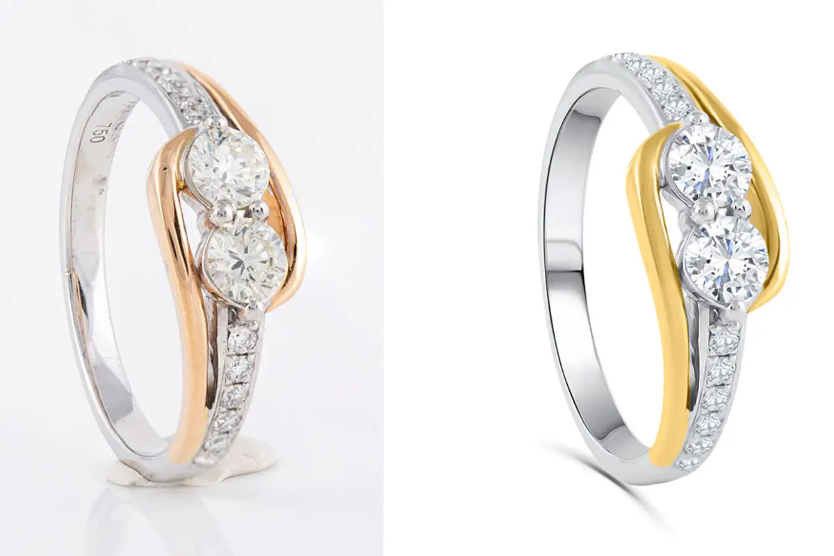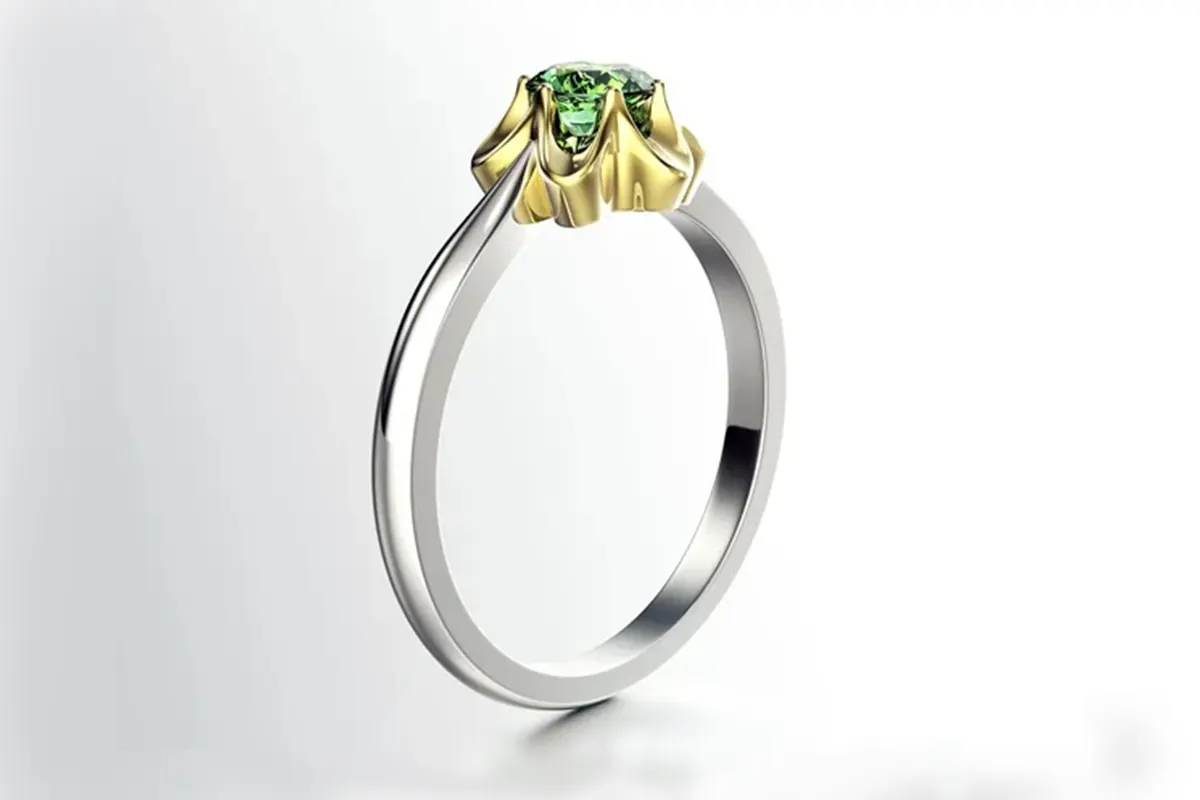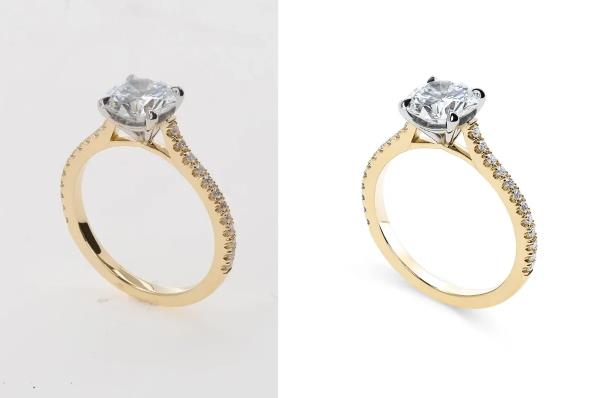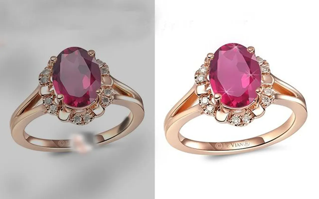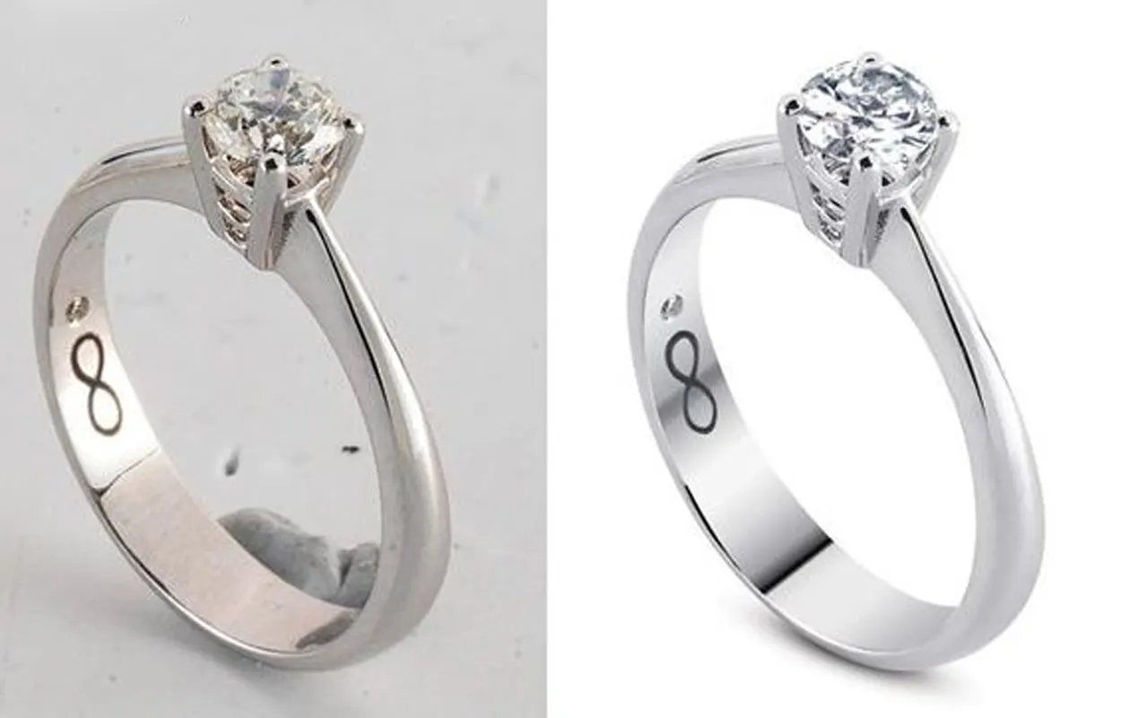 the ring has been noticeably retouched compared to the first one. In this version, the metal surface appears completely smooth, with all scratches and blemishes removed, giving it a flawless finish. The stone has been brightened and made clearer, enhancing its sparkle and overall appeal. Additionally, the lighting, reflections, and shadows have been digitally adjusted to make the ring look more polished and shiny. As a result, the image looks less like a raw photograph and more like a digitally enhanced or rendered version designed for presentation or promotional purposes.