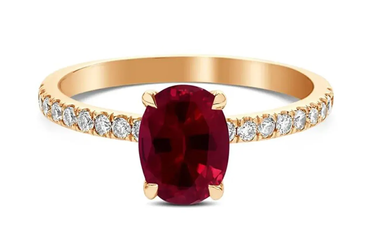 This image of the ring has also been digitally retouched to appear flawless and polished. The gold band looks perfectly smooth and shiny without any scratches or imperfections. The heart-shaped red gemstone has been enhanced to show deep, vibrant color and sharp light reflections, making it appear more brilliant. The small white stone next to it is also shown with added clarity and sparkle. The overall effect of the retouching makes the ring look more like a high-quality promotional rendering rather than a natural photograph, highlighting its elegance and luxurious appeal.